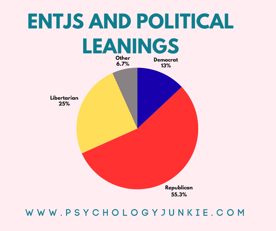 - ENTJs, on the other hand, leaned Republican (55%) and valued leadership, structure, and getting things done, sometimes regardless of party labels.
