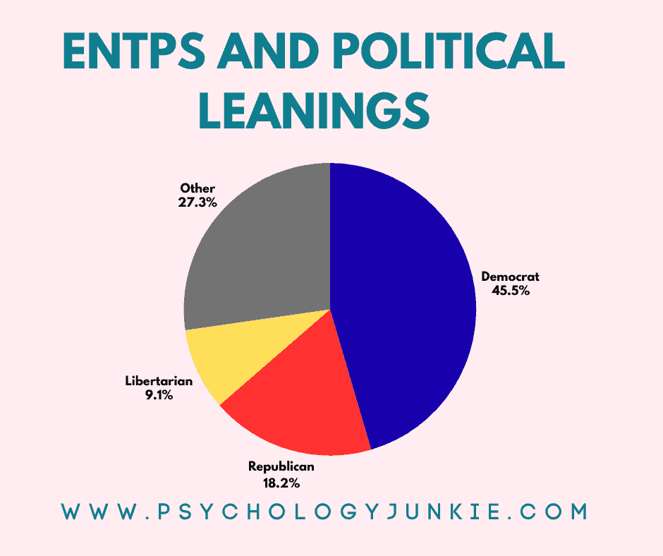 ENTP (45.5% Democrat, 18.2% Republican, 9.1% Libertarian, 27.3% Other)