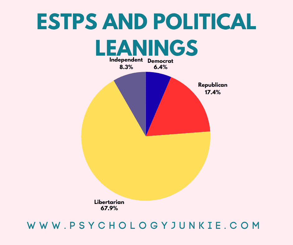 - ESTPs leaned heavily Libertarian (67.9%), with many declaring both major parties “inefficient.”