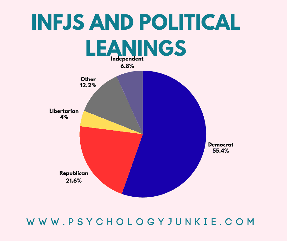 INFJ (55.4% Democrat, 21.6% Republican, 4% Libertarian, 6.8% Independent, 12.2% Other)
