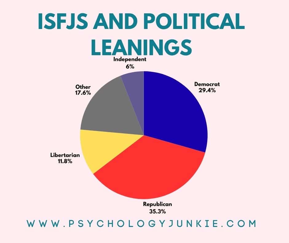 ISFJ (35.3% Republican, 29.4% Democrat, 11.8% Libertarian, 5.9% Independent, 17.6% Other)