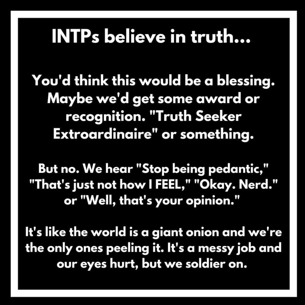 But don’t worry, INTPs. We can appreciate you from here. As we drown in a sea of posturing, moral relativism, and pandering to lowest common denominators, your logical approach is like a beacon of hope. We know you’re in there, diligently breaking down the walls of ignorance, even if no one really gives you the appreciation you deserve. Thank you.