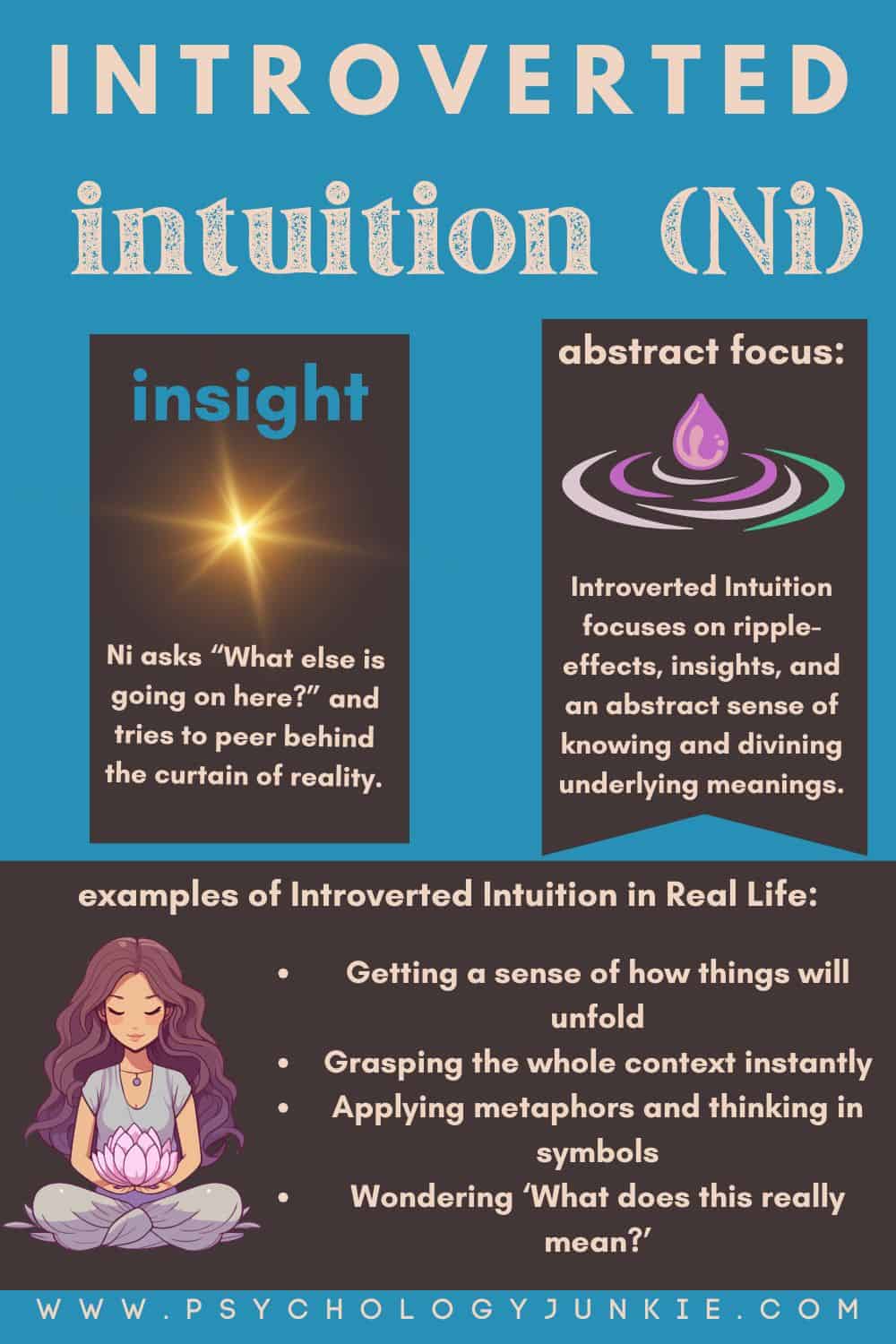 - They focus on inner images and symbols rather than outer facts. Carl Jung said Ni perceives the “inner object”—the unconscious images and archetypes that shape how we experience life. These often feel more real to Ni types than the external world itself.