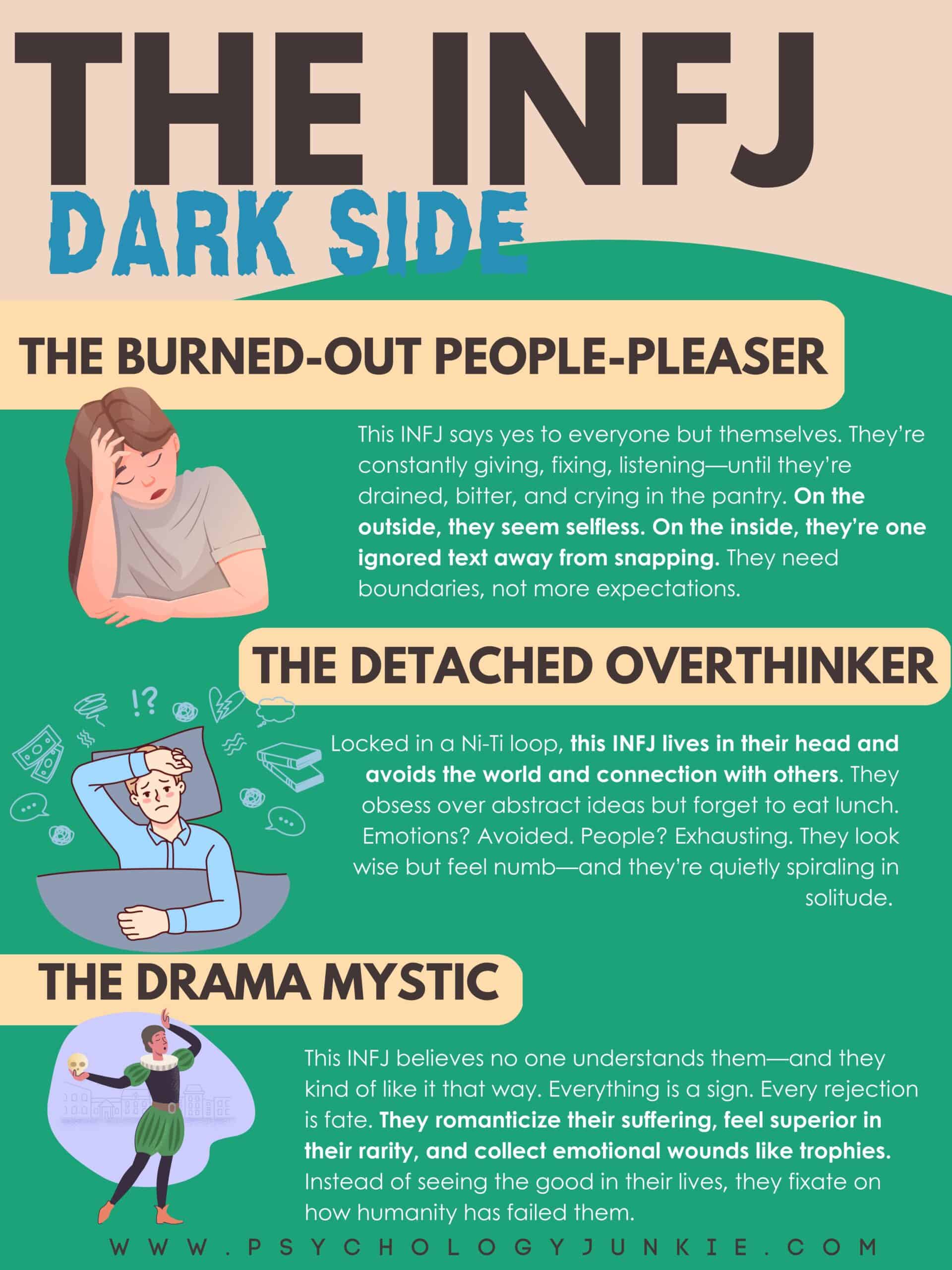 In this article, we’re flipping the spotlight. We’re not just talking about the INFJ’s magical intuition or their knack for reading a room. We’re digging into the shadowy corners: the unhealthy patterns, the emotional minefields, the behaviors you probably wish you didn’t relate to…but totally do.