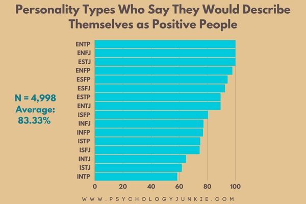 Hi, I’m an INTP and I have to partially disagree with this article. Just because some describe themselves as “positive” doesn’t necessarily mean they are. What I do see from this survey is that some of the least introspective personalities describe themselves as being positive and the more introspective ones tend to be more realistic. I actually wouldn’t have matched up with other INTPs in this survey, because I do try to be positive and I tend to keep my sense of humor in tense or stressful situations. Also, not everyone’s perception of positive and negative is the same.