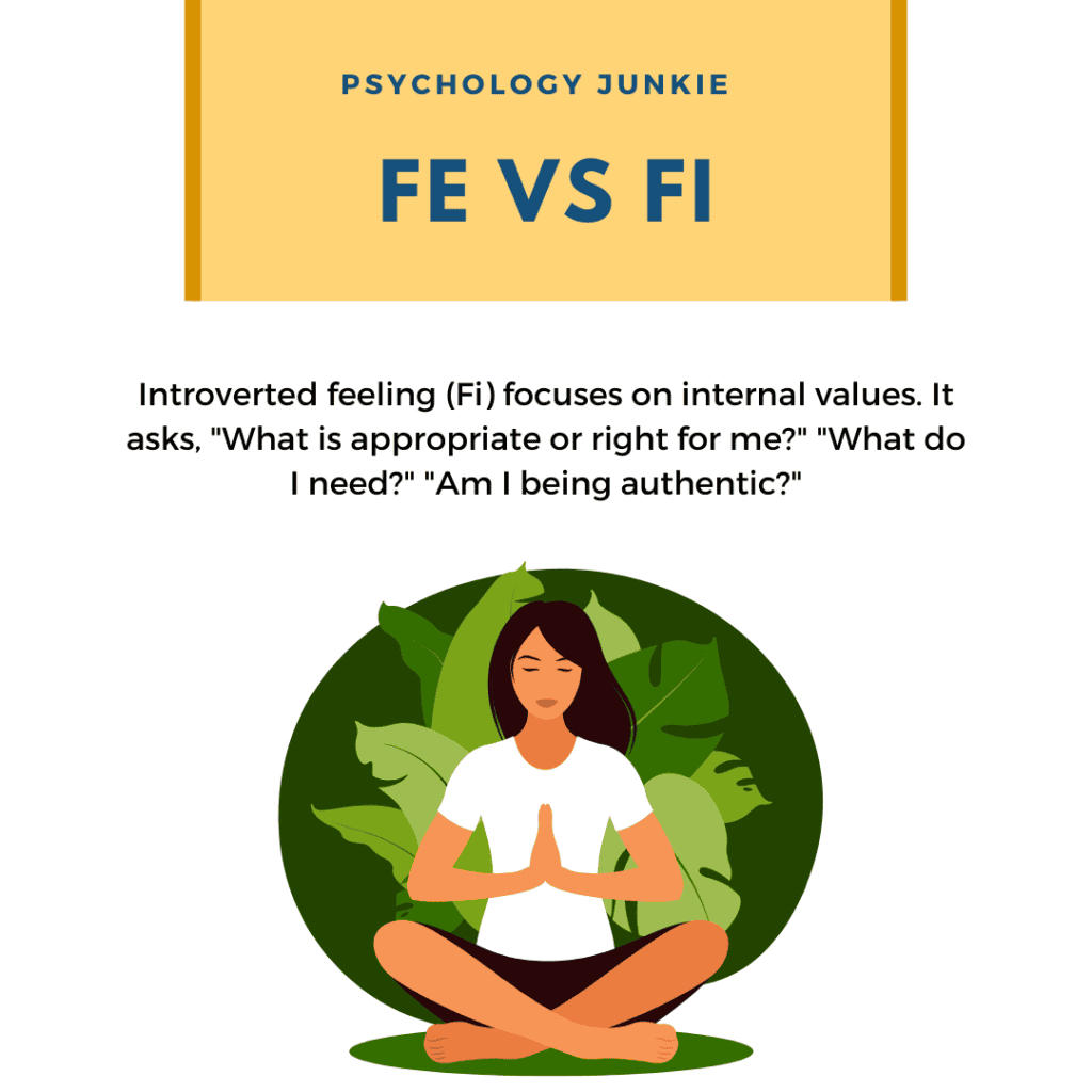 Extraverted Feeling is one of two Feeling functions. The other Feeling function is called Introverted Feeling (Fi). Fi-users are focused on aligning themselves with their individual values, feelings, and desires and creating internal harmony. To do this, they track their own values, tastes, and emotions and internally analyze them. They ask themselves, “What matters to me?”